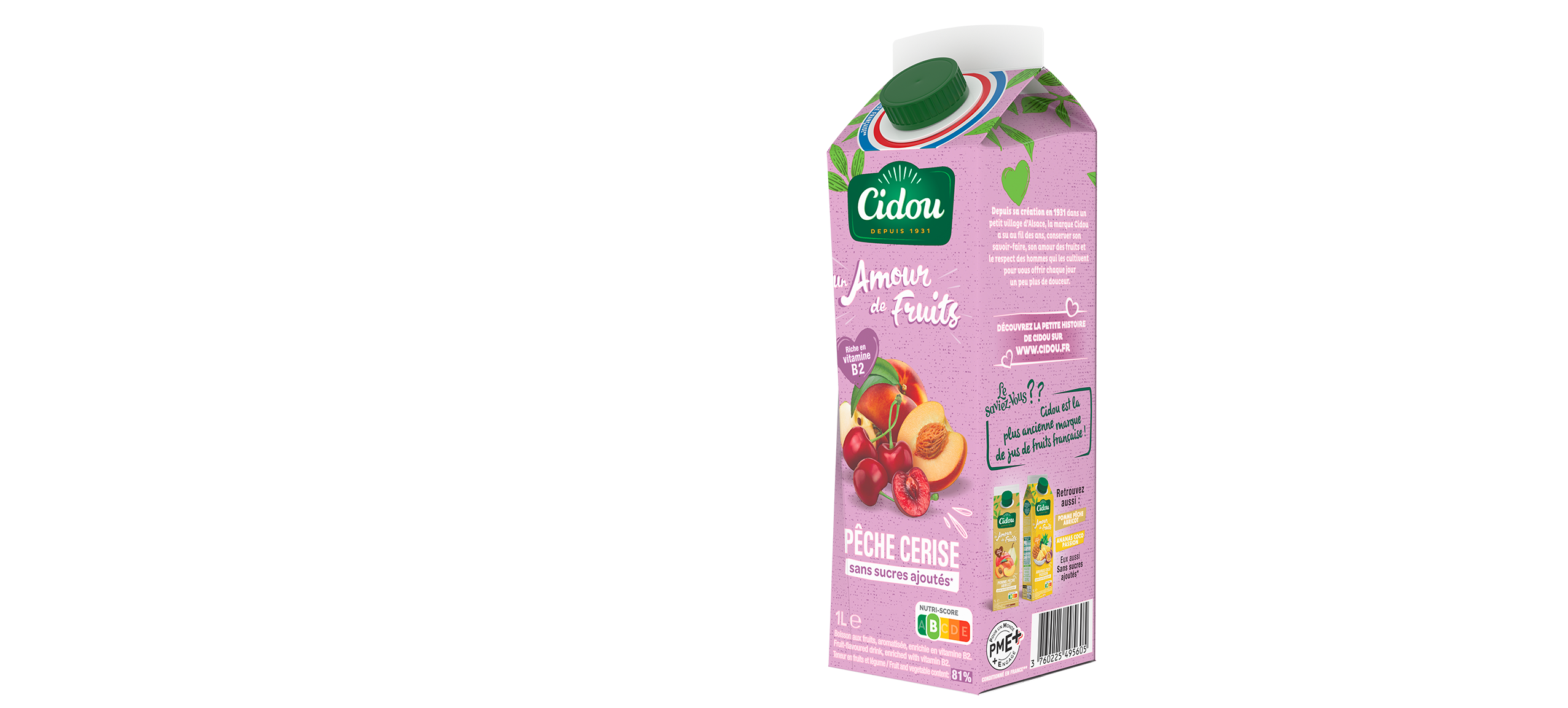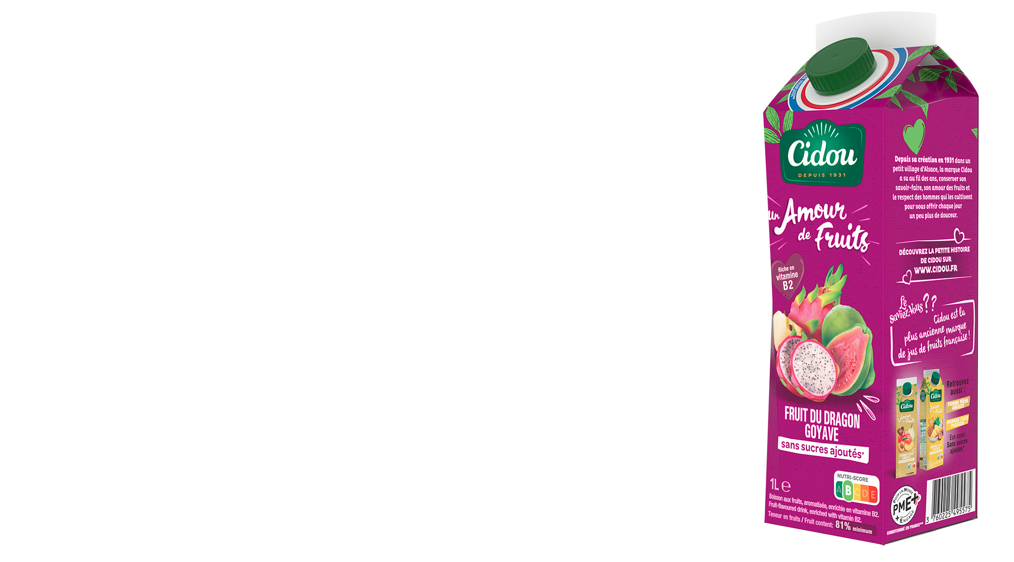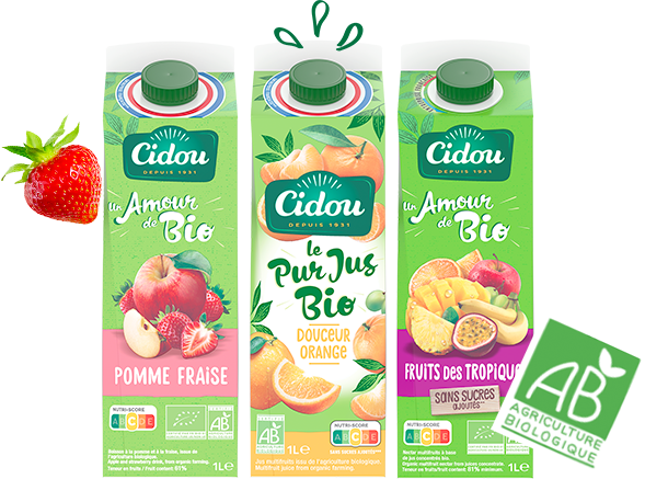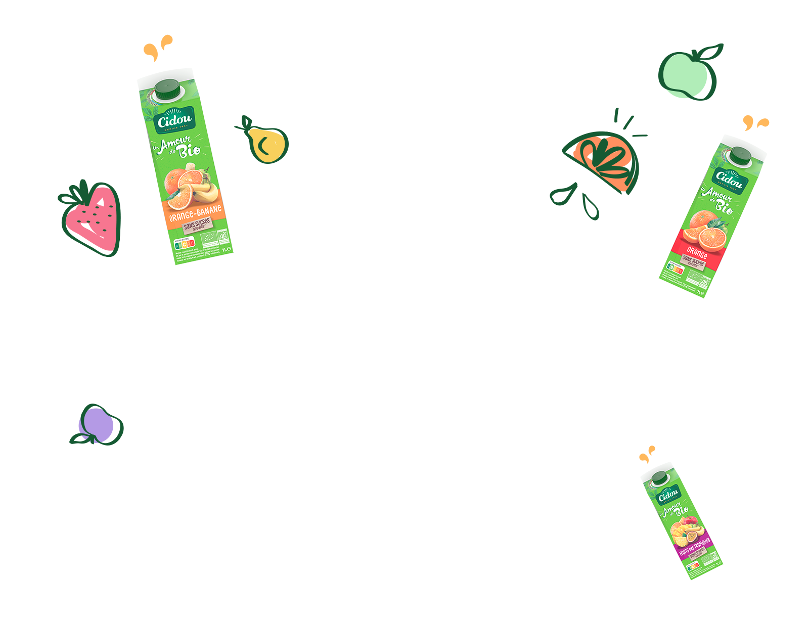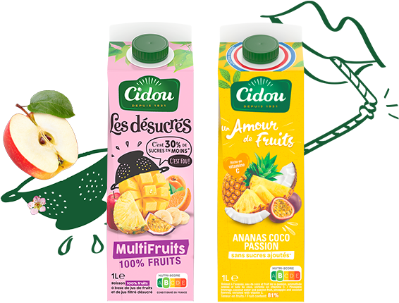 Depuis 1931, Cidou est une marque française qui propose des jus de fruits et des boissons gourmands. Au cœur de notre mission ? Révéler le meilleur des fruits et réduire les sucres lorsque c’est possible… tout cela en toute transparence. Chaque zeste compte pour adoucir le monde !